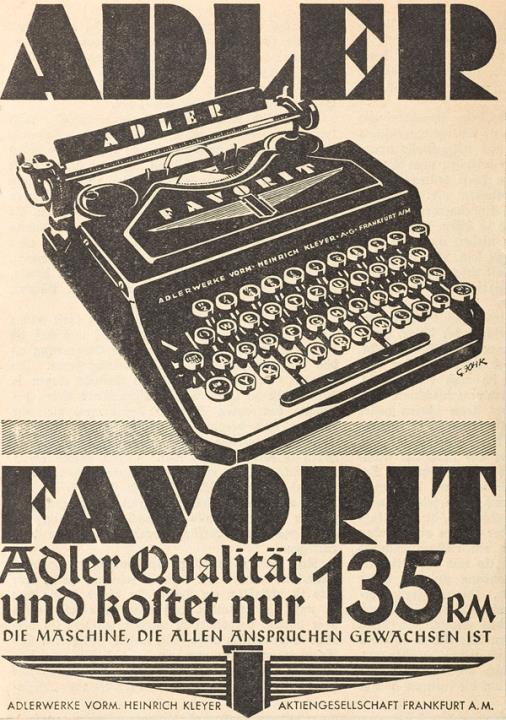 Werbeanzeige für Schreibmaschine Adler Favorit monochrom
