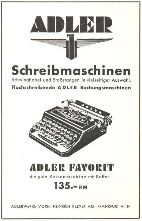 Werbeanzeige für Schreibmaschine Adler Favorit monochrom