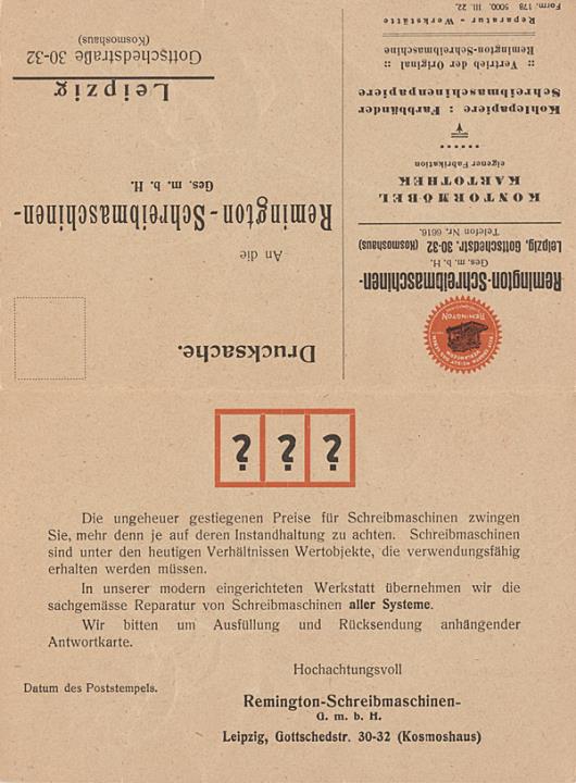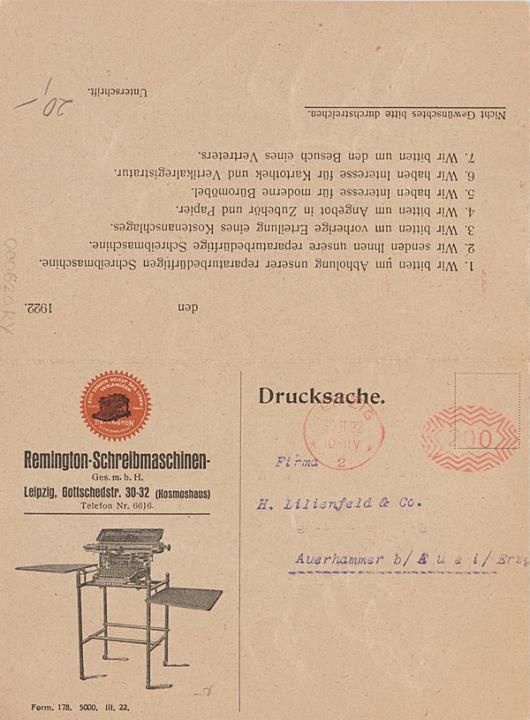 Antwortpostkarte; Grafik, polychrom; Nr. 178.5000.III.22 Werbekarte: adressiert an Firma H. Lilienfeld & Co., Auerhammer; Freistempel Leipzig/30.11.1922, Wert 200 Pf. / Werbetext zu Schreibmaschine Remington Antwortkarte: vorgedruckte Anschrift / vorgedruckter Anfragetext