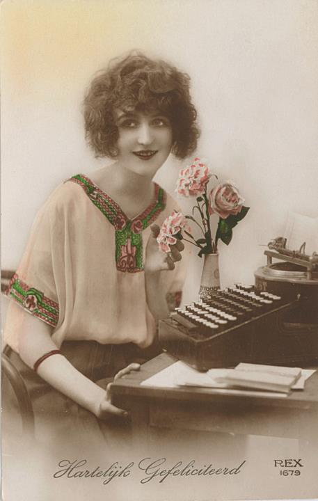 Illustrierte Postkarte; Fotografie, koloriert; Serie Rex 1679 Rückseite: Frau mit Schreibmaschine, Blumen als Dekoration Vorderseite beschrieben