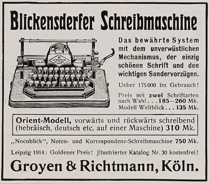 Werbeanzeige für Schreibmaschine Blickensderfer monochrom