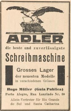Werbeanzeige für Schreibmaschine Adler Allein-Vertreter: Hugo Müller, Porto Alegre monochrom