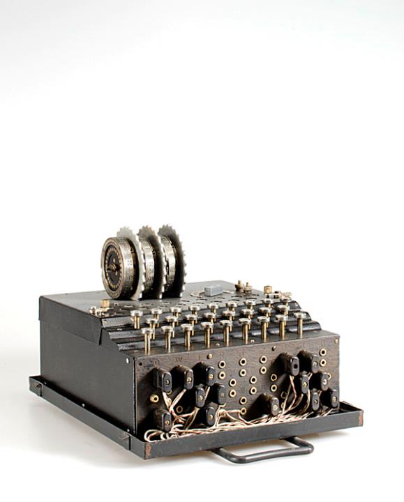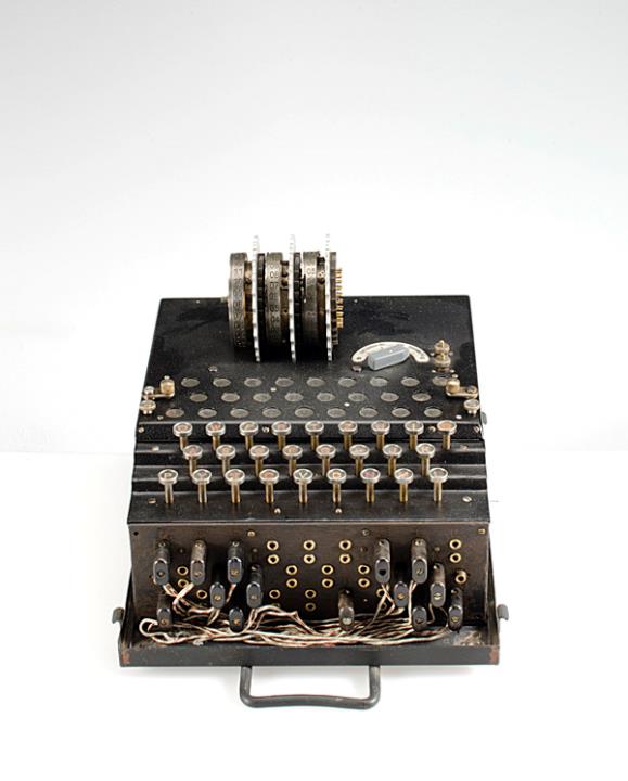 Elektrisch-mechanische Schlüsselmaschine Enigma Modell I; ohne Abdeckung Eigenschaften: Walzensatz mit drei Rotoren, Lampenfeld (dreireihig, 26 Stück), Steckerbrett, Tastatur (universal, dreireihig, 26 Großbuchstaben), 4.5 Volt Batterie, Prinzip der polyalphabetischen Substitution Konstrukteur: Arthur Scherbius, Seriennummer 11581