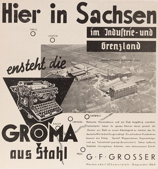 Werbeanzeige für Schreibmaschine Groma monochrom