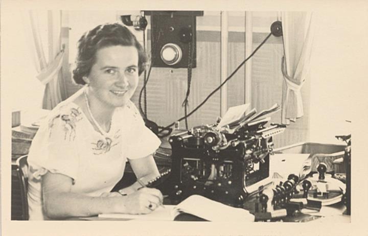 Illustrierte Postkarte; Fotografie, monochrom Rückseite: Sekretärin mit Schreibmaschine in einem Büro, im Hintergrund Telefonapparat Vorderseite nicht beschrieben