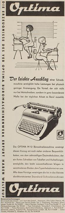 Werbeanzeige für Schreibmaschine Optima M12 monochrom
