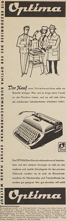 Werbeanzeige für Schreibmaschine Optima Elite monochrom