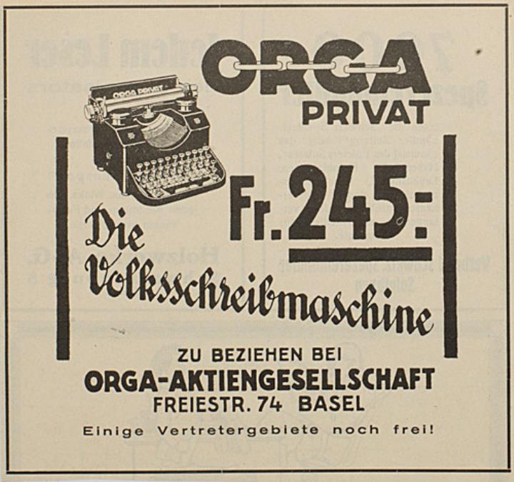 Werbeanzeige für Schreibmaschine Orga monochrom