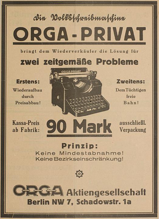 Werbeanzeige für Schreibmaschine Orga monochrom