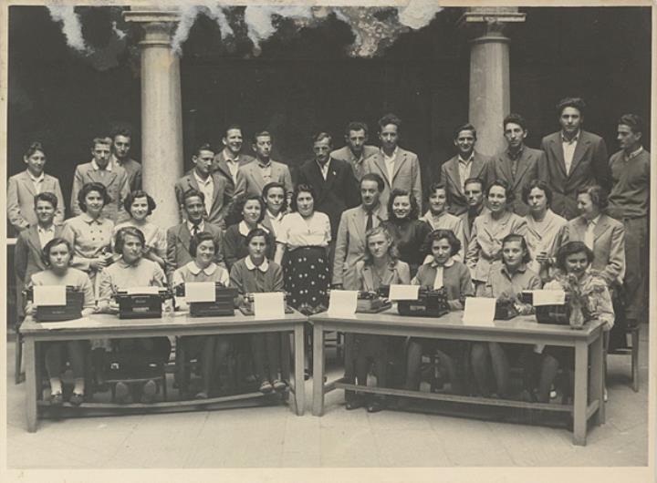 Fotografie, monochrom weibliche und männliche Mitarbeiter eines Betriebes posieren für ein Gruppenbild, in der ersten Reihe Tisch mit Schreibmaschinen (Everest, Olivetti)