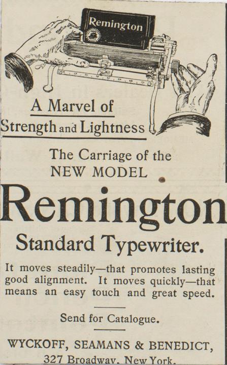 Werbeanzeige für Schreibmaschine Remington; auf Karton geklebt monochrom
