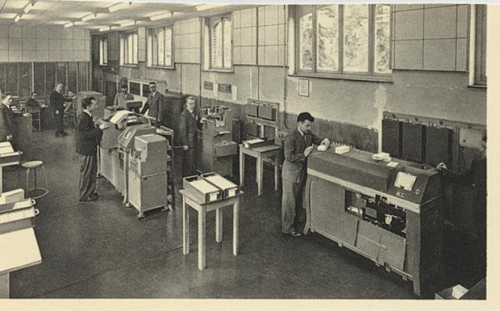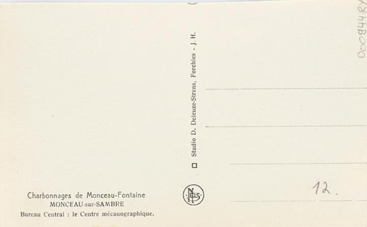 Illustrierte Postkarte; Fotografie, monochrom Rückseite: männliche Mitarbeiter in einem Raum mit Büromaschinen Vorderseite mit Beschreibungstext: Charbonnages de Monceau-Fontaine, Bureau Central: le Centre mécanographique
