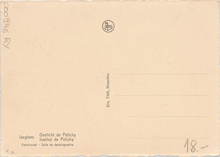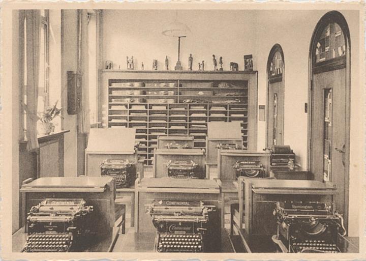Illustrierte Postkarte; Fotografie, monochrom Rückseite: Unterrichtsraum mit Schreibmaschine Continental Vorderseite mit Beschreibungstext: Iseghem Institut de Pelichy - Salle de dactylographie