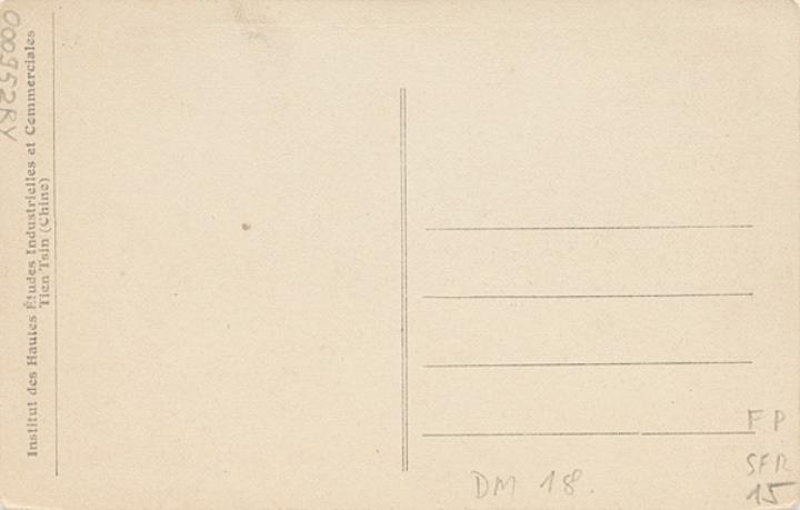 Illustrierte Postkarte; Fotografie, monochrom Rückseite: Männer im Arbeitskittel in einem Testlabor mit Schreibmaschine Vorderseite mit Beschreibungstext: Institut des Hautes Études Industrielles et Commerciales Tien Tsin (Chine)