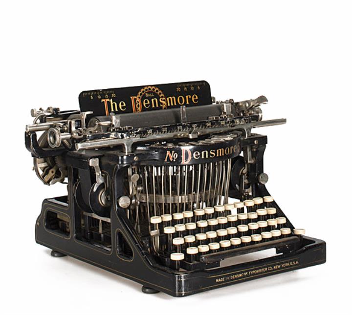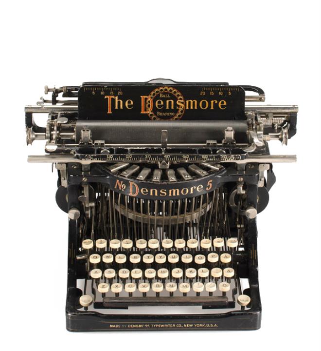 Schreibmaschine Densmore Modell 5 Eigenschaften: Typenhebel, Unteranschlag, einfache Umschaltung, Farbband Tastatur: universal, vierreihig, 42 Schreibtasten Konstrukteur: Amos Densmore, Walter J. Barron, Franz Xaver Wagner Besonderheit: Typenhebel mit Kugellager, abnehmbarer Wagen, Seriennummer 39184