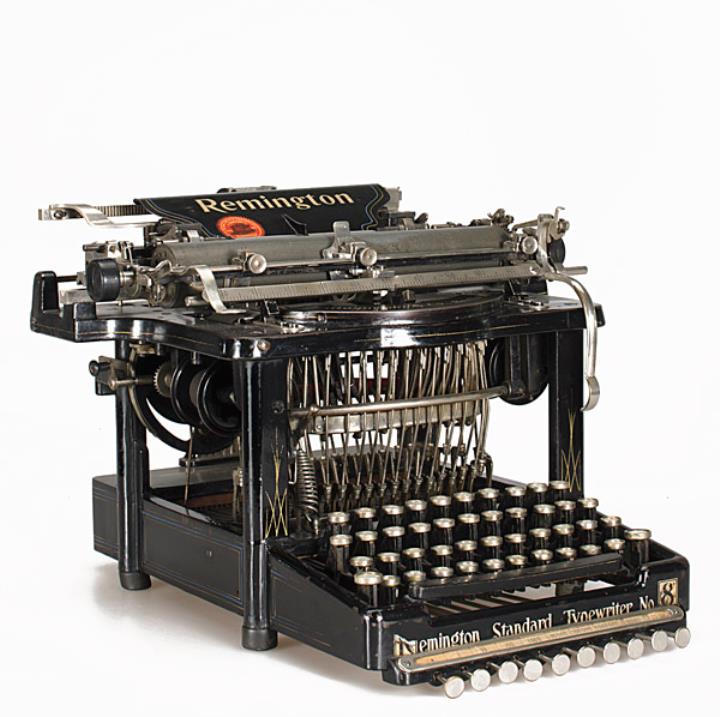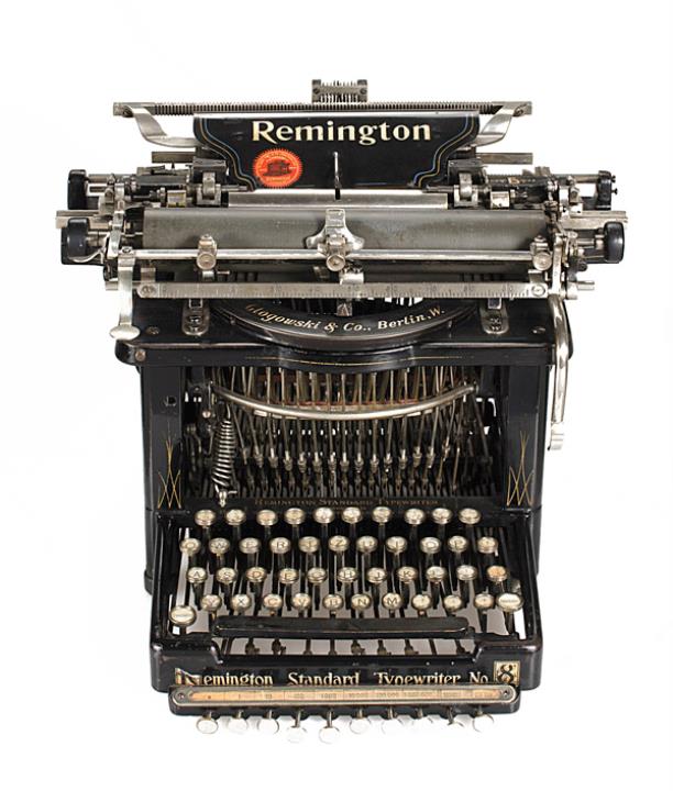 Schreibmaschine Remington Modell Standard 8 Eigenschaften: Typenhebel, Unteranschlag, einfache Umschaltung, Farbband, Gorin-Tabulator Tastatur: universal, vierreihig, 42 Schreibtasten Konstrukteur: William McKendree Jenne, Jefferson Moody Clough, Byron Alden Brooks, Seriennummer 18473