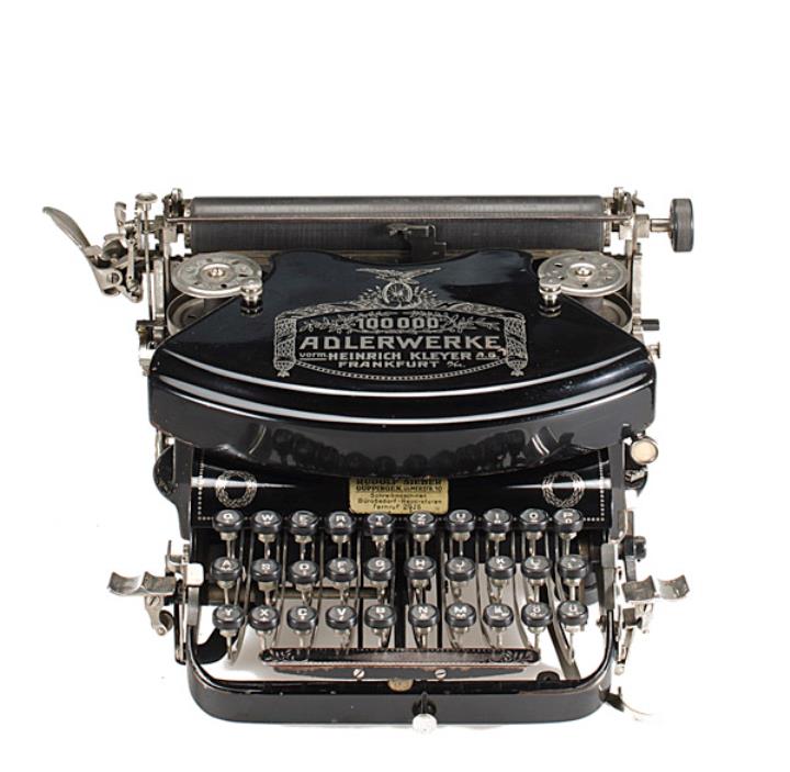 Schreibmaschine Adler Modell 7 Eigenschaften: Typenstangen, Vorderanschlag, doppelte Umschaltung, Farbband Tastatur: universal, dreireihig, 30 Schreibtasten Konstruktion: nach Patenten von Wellington Parker Kidder Besonderheit: erste kommerziell erfolgreiche Sichtschrift-Schreibmaschine; Abdeckung mit Sonderdekor (100.000 produzierte Schreibmaschinen), Seriennummer 103312