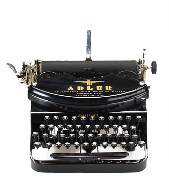 Schreibmaschine Adler Modell 37 Eigenschaften: Typenstangen, Vorderanschlag, einfache Umschaltung, Farbband Tastatur: universal, vierreihig, 42 Schreibtasten, Seriennummer 546514