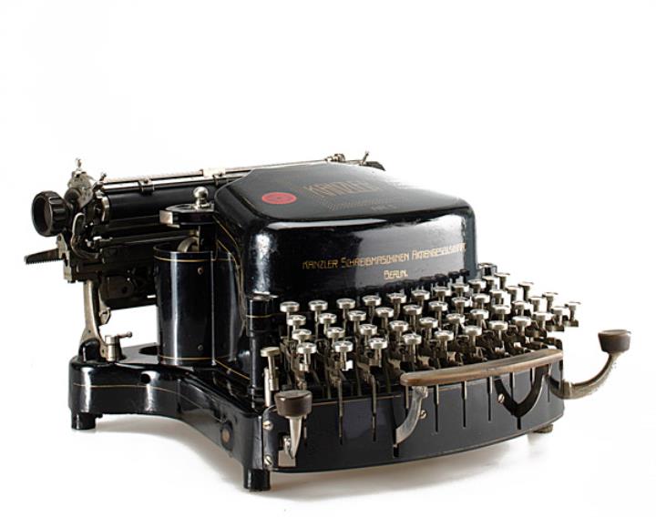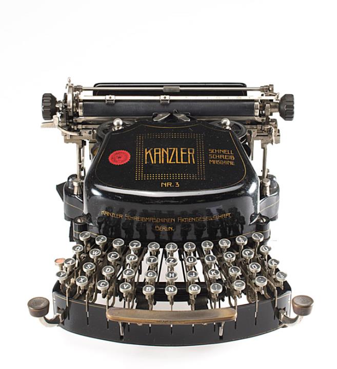 Schreibmaschine Kanzler Modell 3 Eigenschaften: Typenhebel/Typenstangen, Vorderanschlag, einfache Umschaltung, Farbband Tastatur: gerundet, universal, vierreihig, 44 Schreibtasten Konstrukteur: Paul Grützmann Besonderheit: Kombination aus Stoß- und Schwinghebelmechanismus, Seriennummer 9113