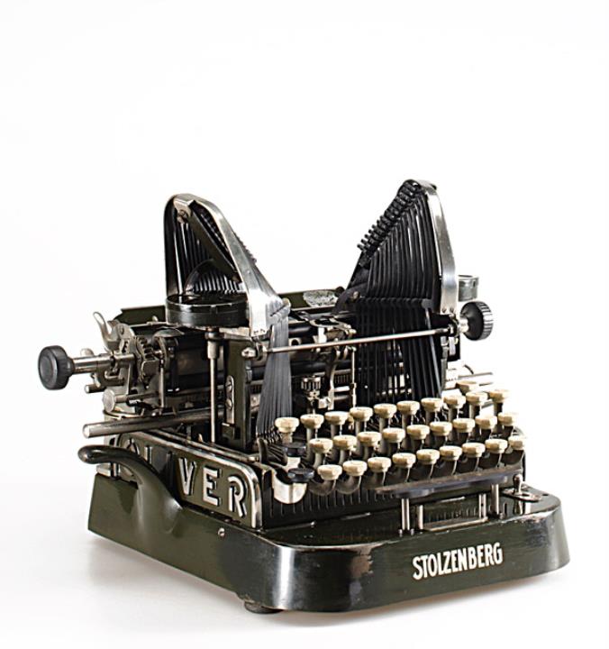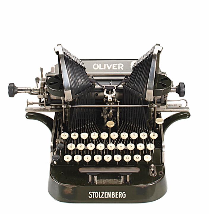 Schreibmaschine Oliver Modell 3 Eigenschaften: Typenbügel, Oberanschlag, doppelte Umschaltung, Farbband Tastatur: universal, dreireihig, 28 Schreibtasten Konstrukteur: Thomas Oliver Besonderheit: geteiltes Typenträgerfeld; die Fabrik Stolzenberg hatte zeitweise den General-Vertrieb der Oliver in Deutschland über, Seriennummer 168791