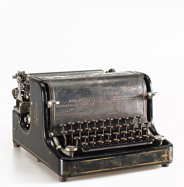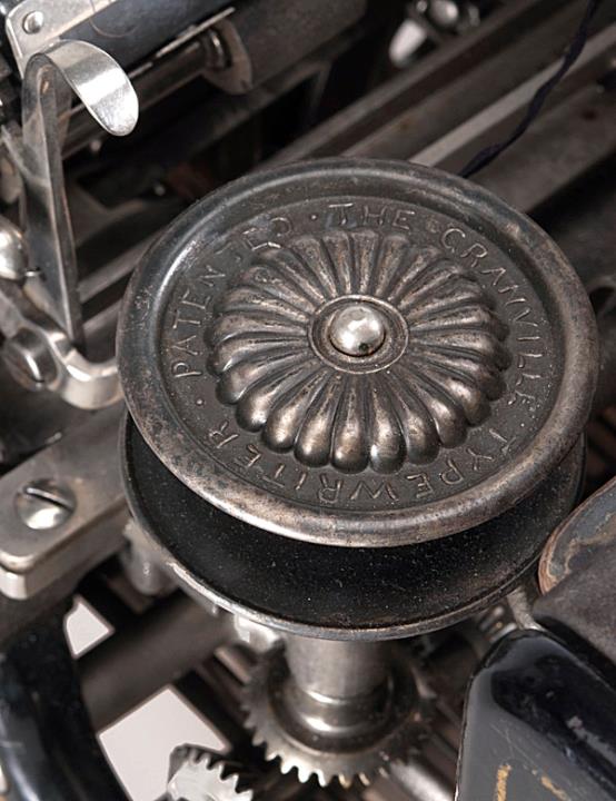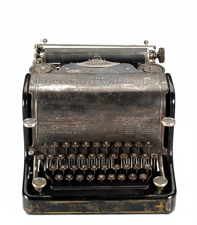 Schreibmaschine Granville Automatic Eigenschaften: Typenstangen, Vorderanschlag, einfache Umschaltung, Farbband Tastatur: universal, vierreihig, 40 Schreibtasten Konstrukteur: Bernard Granville Besonderheit: Zeilenschaltung und Rückführen/Lösen des Wagens erfolgen über Tasten, Frontalabdeckung in Kupfer, Seriennummer 5464