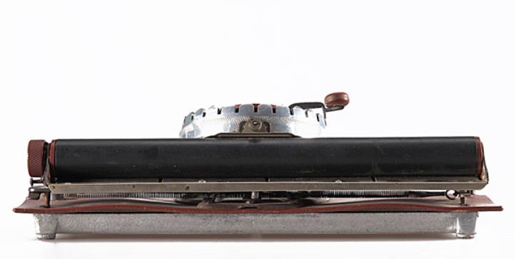 Tragbare Schreibmaschine, Zeigerschreibmaschine, Eintasterschreibmaschine, Typenscheibe, Oberanschlag, Farbröllchen