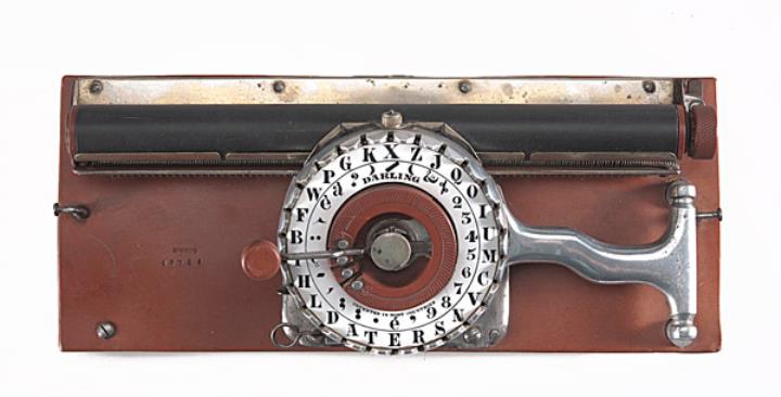 Schreibmaschine Darling Eigenschaften: Zeiger/Eintaster, Typenscheibe (52 Zeichen), doppelte Umschaltung, Oberanschlag, Farbröllchen Konstrukteur: Samuel Gertsch, Gertsch & Cie. Besonderheit: in den U.S.A. von Robert Ingersoll & Bro. vertrieben andere Bezeichnung: New America, Seriennummer 714
