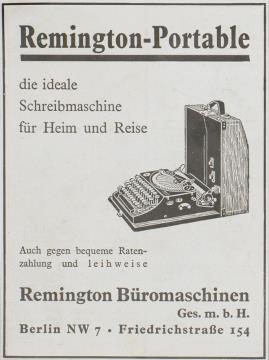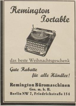 Werbeanzeige für tragbare Schreibmaschinen Remington monochrom