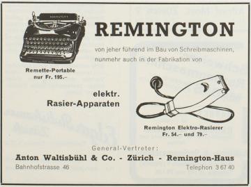 Werbeanzeige für tragbare Schreibmaschine und elektrischer Rasierapparat Remington monochrom