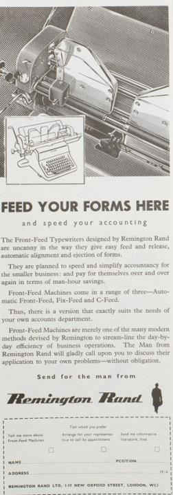 Werbeanzeige für Schreibmaschine Remington mit Formulareinzug monochrom