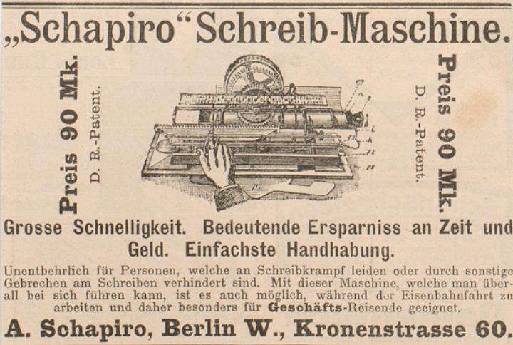 Werbeanzeige für Schapiro Schreib-Maschine monochrom