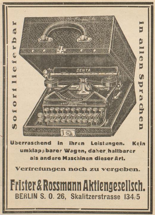 Werbeanzeige für Schreibmaschine Senta monochrom