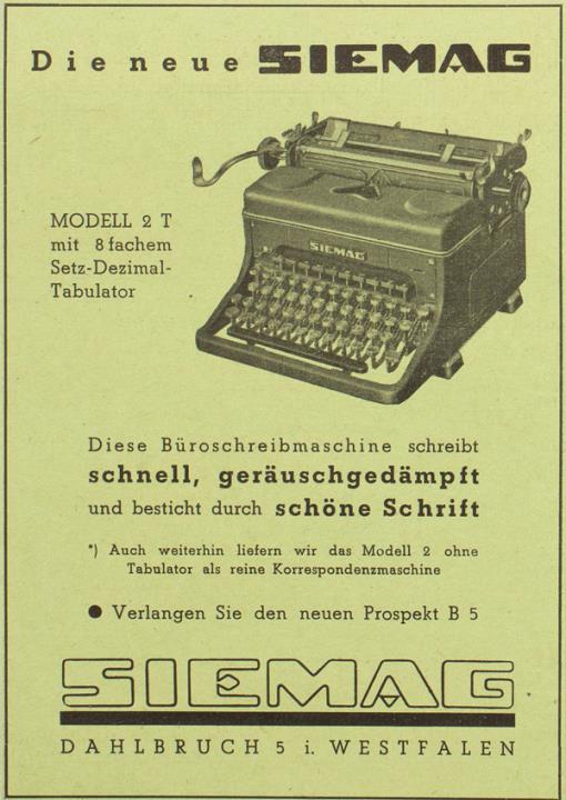 Werbeanzeige für Schreibmaschine Siemag monochrom