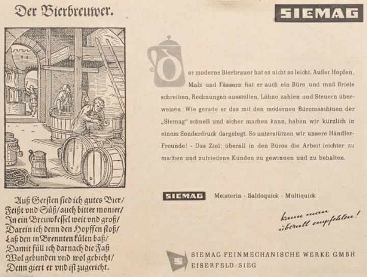 Werbeanzeige für Schreibmaschine Siemag; mit Holzstich-Abbildung monochrom