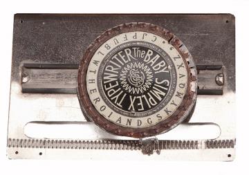 Schreibmaschine Baby Simplex mit Original Schachtel und zwei mit der Maschine beschriebenen Zetteln Eigenschaften: Zeiger/Eintaster, Typenscheibe aus Gummi, Großbuchstaben, Oberanschlag, Farbkissen Konstrukteur: Arnaldo Myrthle English, Philip Becker Besonderheit: wurde zum Schreiben direkt auf das Papier gelegt