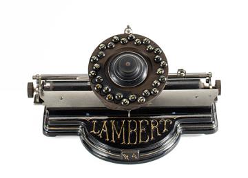 Schreibmaschine Lambert Modell 1 Eigenschaften: Eintaster, Typenring aus Gummi, Oberanschlag, doppelte Umschaltung, Farbkissen Tastatur: ringförmig, ideal, 28 Schreibtasten Konstrukteur: Francoise (Frank) Lambert Besonderheit: ringförmige Anordnung der Tasten und Typen, Option der Schrägschrift