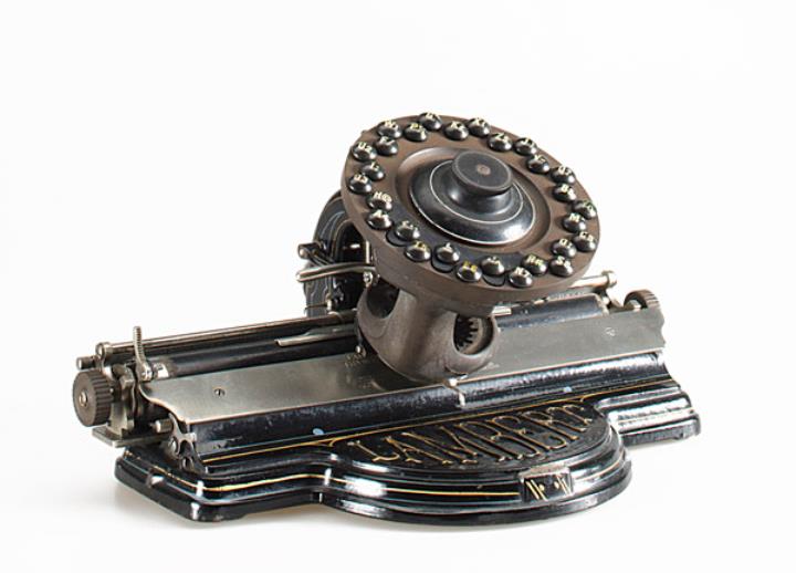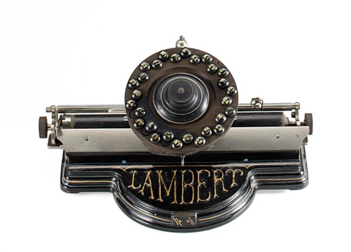 Schreibmaschine Lambert Modell 1 Eigenschaften: Eintaster, Typenring aus Gummi, Oberanschlag, doppelte Umschaltung, Farbkissen Tastatur: ringförmig, ideal, 28 Schreibtasten Konstrukteur: Francoise (Frank) Lambert Besonderheit: ringförmige Anordnung der Tasten und Typen, Option der Schrägschrift, Seriennummer 2176