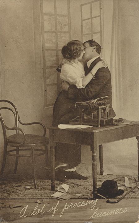 Illustrierte Postkarte; Fotografie, monochrom; EC Series 1550 Rückseite: Vorgesetzter/Mitarbeiter und Sekretärin mit Schreibmaschine in romantischer Büroszene Vorderseite nicht beschrieben