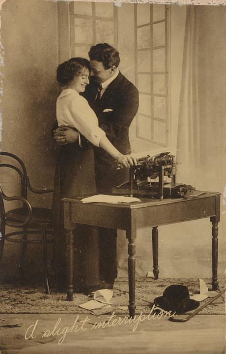 Illustrierte Postkarte; Fotografie, monochrom; EC Series 1550 Rückseite: Vorgesetzter/Mitarbeiter und Sekretärin mit Schreibmaschine in romantischer Büroszene Vorderseite nicht beschrieben