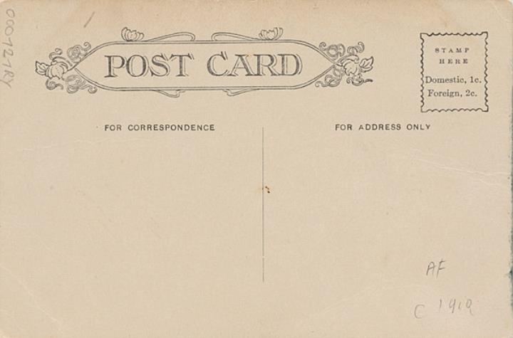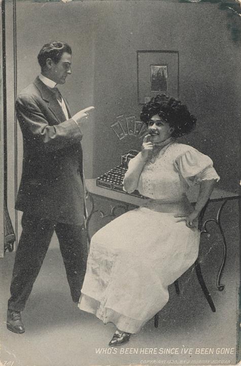 Illustrierte Postkarte; Grafik nach Fotografie, monochrom; copyright 1908 J. Murray Jordan Rückseite: Büroszene; Vorgesetzter befragt seine Sekretärin, im Hintergrund verlässt ein Mann das Büro Vorderseite nicht beschrieben