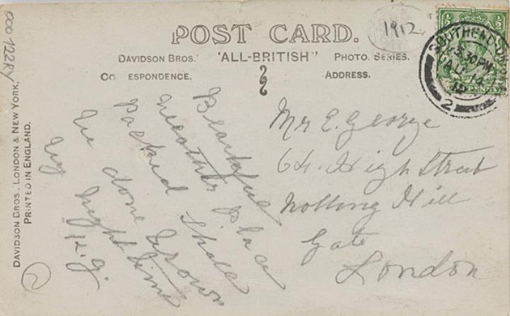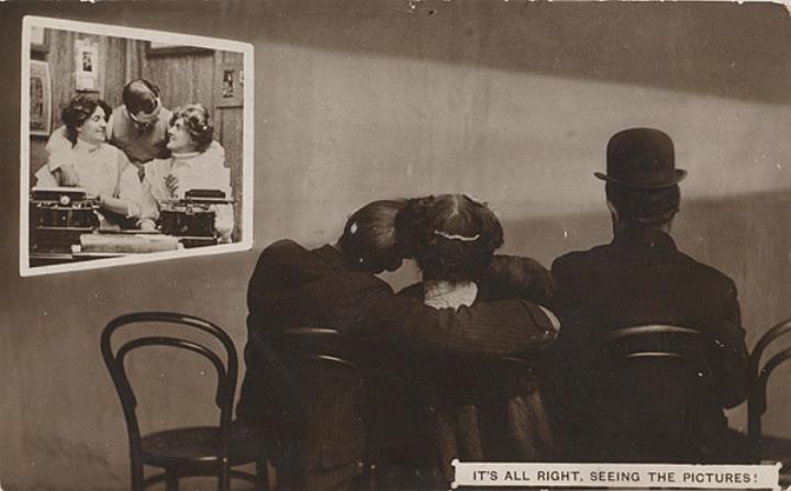 Illustrierte Postkarte; Fotomontage, monochrom Rückseite: Rückenansicht einer Frau und zweier Männer, die eine Bildprojektion (Büroszene) betrachten Vorderseite: beschrieben; adressiert an Mr. George, London; Briefmarke Postage Revenue (U.K.) Half Penny; Poststempel Southend/Au 14 1912