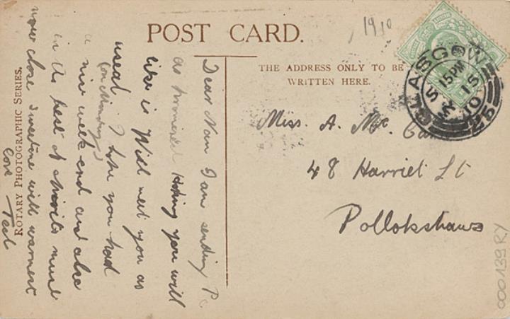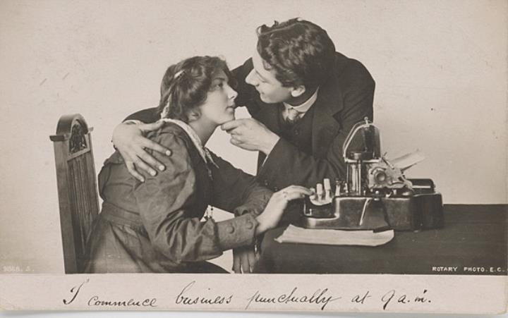 Illustrierte Postkarte; Fotografie, monochrom; Rotary Photo Nr. 9868.S. Rückseite: Vorgesetzter/Mitarbeiter und Sekretärin in romantischer Büroszene, kleiner Tisch mit Schreibmaschine Vorderseite: beschrieben; adressiert an Miss Carrell (?), Pollokshaws; Briefmarke Postage Revenue (U.K.) Half Penny; Poststempel Glasgow/My 15 1910