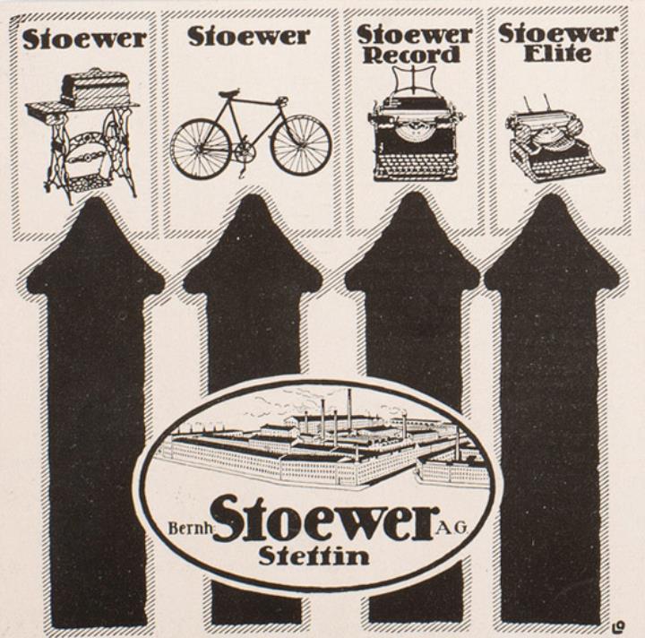 Werbeanzeige für Schreibmaschine, Nähmaschine und Fahrrad Stoewer monochrom