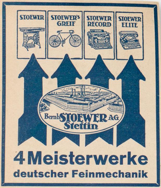 Werbeanzeige für Schreibmaschine, Nähmaschine und Fahrrad Stoewer monochrom