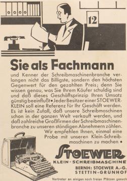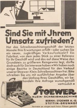 vierseitige Werbeanzeige für Schreibmaschine Stoewer Record monochrom