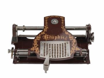 Schreibmaschine Graphic Eigenschaften: Zeiger/Eintaster, Typenplatte aus Gummi (72 Zeichen), Zeichenfeld, Oberanschlag, Farbkissen Konstruktion: nach Schreibmaschine Hall