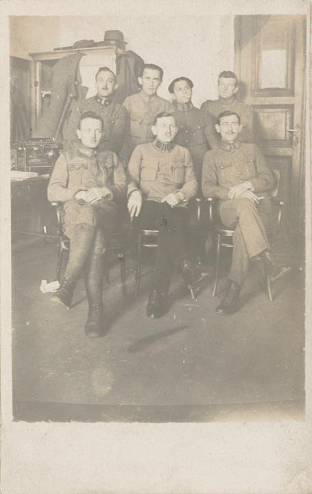 Illustrierte Postkarte; Fotografie, monochrom Rückseite: sieben Männer in Uniform (zwei mit Zigarette) posieren für ein Gruppenbild, im Hintergrund Tisch mit Schreibmaschine Vorderseite nicht beschrieben