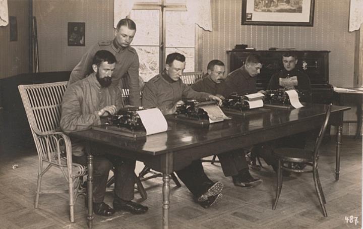 Illustrierte Postkarte; Fotografie, monochrom; Nr. 487 Rückseite: Männer in Uniform beim Maschinenschreiben in einem Zimmer Vorderseite mit Stempel (F. Sunnberg, Phot. Luzern), nicht beschrieben