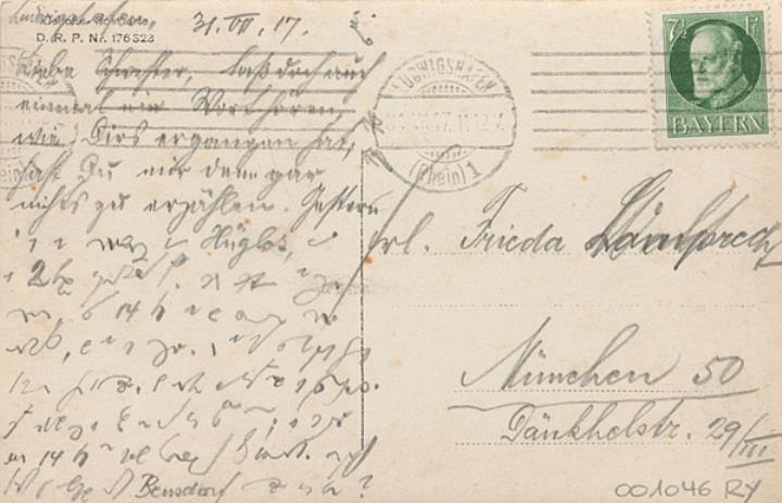 Illustrierte Postkarte; Fotografie, monochrom Rückseite: Mann in Uniform und Sekretärin in einem Schreibzimmer mit Schreibmaschine Vorderseite: beschrieben (teilweise in Kurzschrift), datiert 31.07.1917; adressiert an Frl. Lamprecht, München; Briefmarke Bayern 7 1/2 Pf. Poststempel Ludwigshafen/31 VII 1917