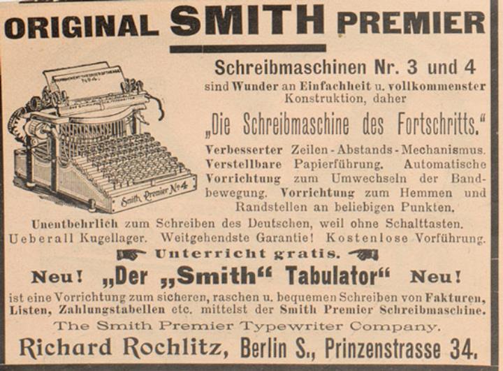 Werbeanzeige für Schreibmaschine Smith Premier monochrom